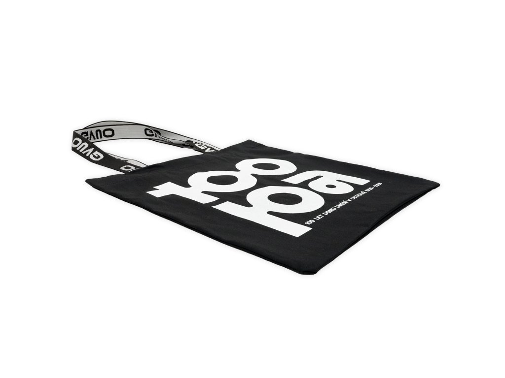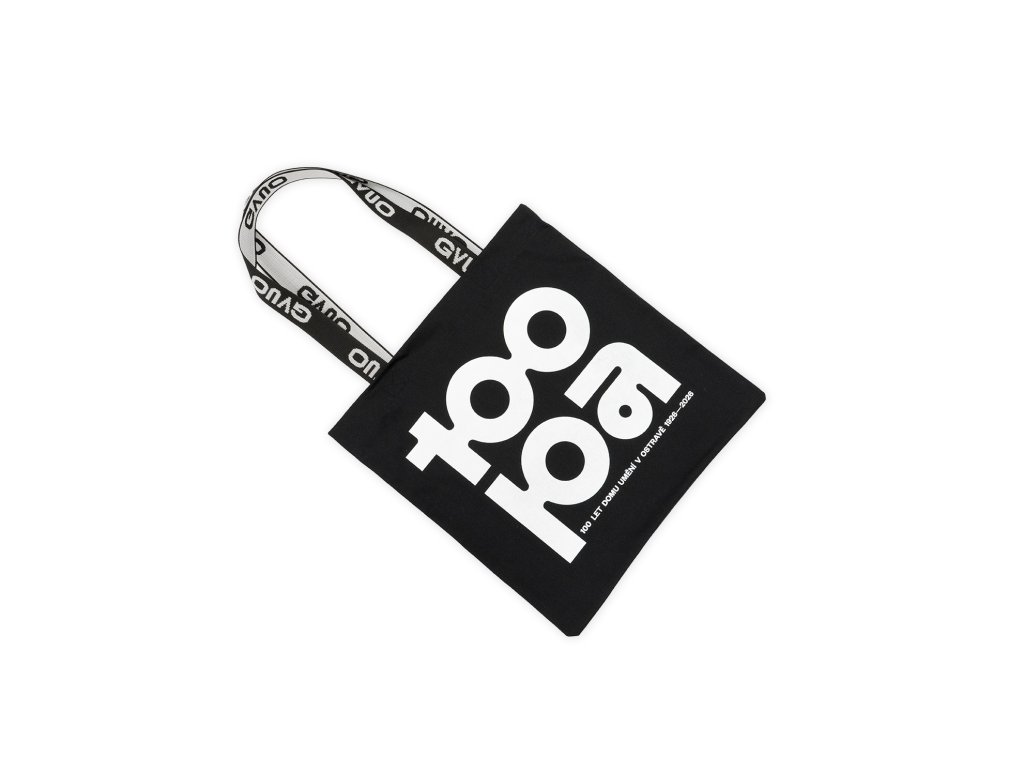 Černá látková taška z 100% bavlny s potiskem 100pa. Místo klasických uší má pevný polypropylenový popruh s nápisem GVUO, díky kterému se taška dobře nosí na rameni.