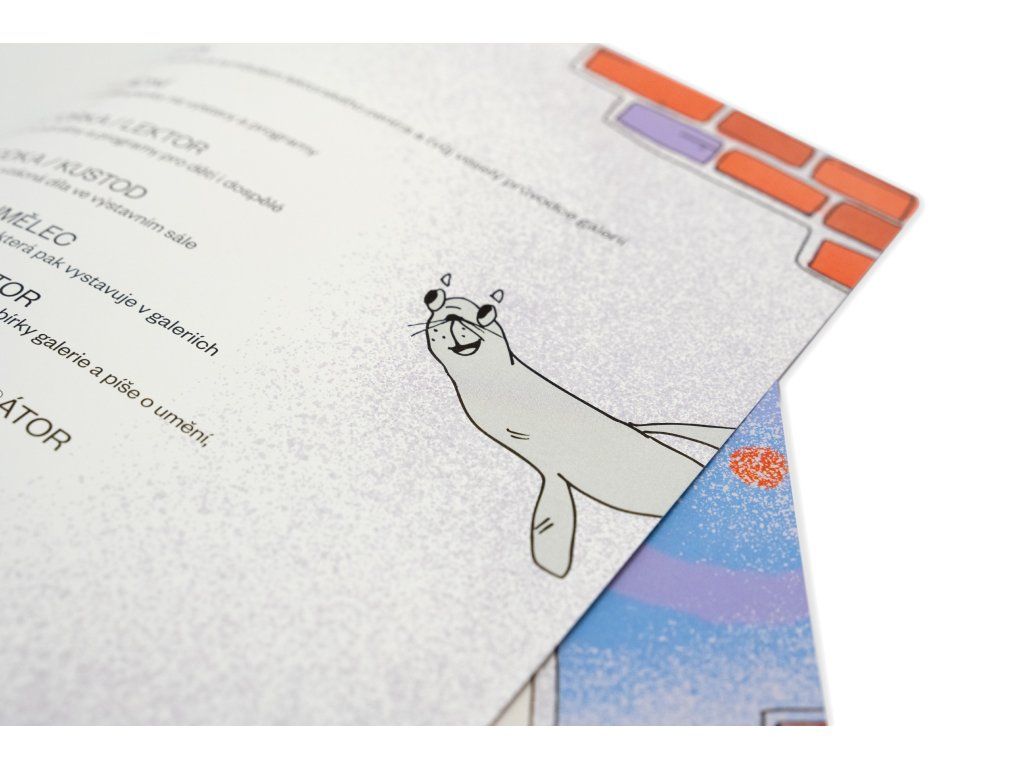 Obrazově-vzdělávací nálepkový sešit Na návštěvě v GVUO je doporučena pro děti od tří let. Hravou formou přibližuje dětem prostředí Domu umění a fungování galerie. Průvodcem je lachtan Serafín, který je symbolem lektorského centra.